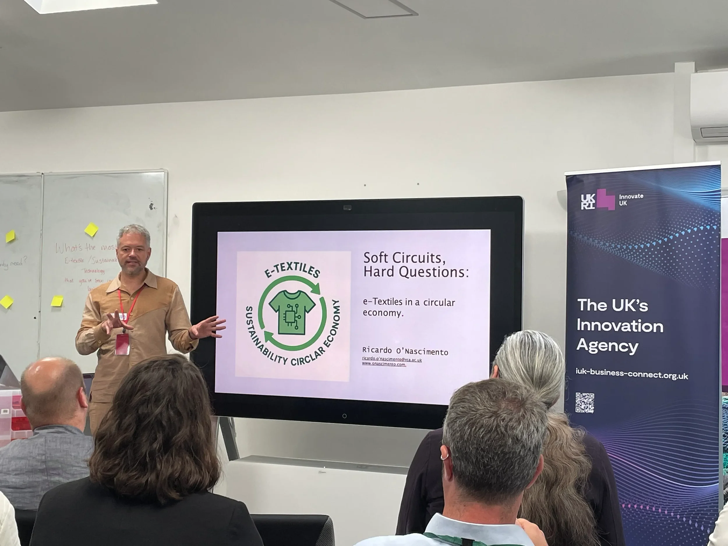 I participated in the E-Textiles and Sustainability Workshop, organised by Innovate UK at QinetiQ’s Advanced Materials Hub, where I delivered a talk titled 'Soft Circuits, Hard Questions'. I presented the latest research on more sustainable and circular e-textiles. I also co-facilitated a participatory design session with Jessica Saunders, bringing together researchers, technologists, and policymakers to explore material innovation, recyclability, and circular design strategies for the future of wearable systems.